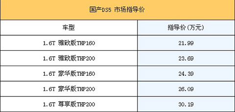 9月27日,長安標致雪鐵龍國產新DS5正式上市銷售,相比在售進口版車型,該車增加了1.6T高功率版新車。該新車本次共推出了1.6升排量的5款車型,售價區間為21.99萬-30.19萬,各車型具體售價如下表所示