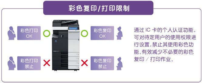 可以設置限制,從而只有使用IC卡認證的用戶才能夠使用該多功能設備。能夠防止信息泄露給那些未經認 證的無IC卡用戶。此外,也可以對單個功能進行限制,例如復印、打印、傳真、掃描、彩色或黑白。
